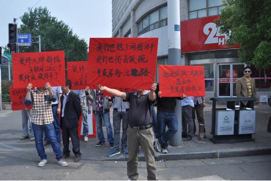 5月7日,“2015中国互联网+家居战略峰会“当日,南京市装修队工人相约集体街头,在中央新模范马口、玄武门和玄武饭店附近举牌,通过这样的方式表示对家装行业互联网转型的不满,认为“家居搞互联网,就是抢传统装修队的饭碗!“。举牌的装修队工人最后进入到玄武饭店峰会现场主办方,表达对互联网冲击下,传统家装工人空间遭到挤压的“不满”,并向参会的互联网家装大佬与专家求助转型之道。